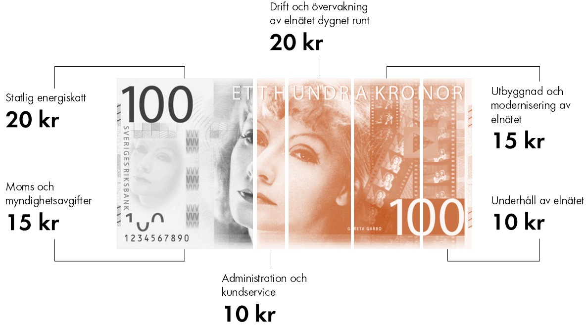Skatter och avgifter går till staten via framför allt elnätsfakturan. Staten tar ut flera olika skatter och avgifter för elen, till exempel energiskatt och moms. Energiskatten, som från och med 1 januari 2024 är 53,5 öre/kWh, hamnar helt och hållet på din elnätsfaktura. En stor del av det du betalar när du hanterar elnätsfakturan är alltså energiskatt. Moms betalar du både på eldistributionstjänsten och på energiskatten.