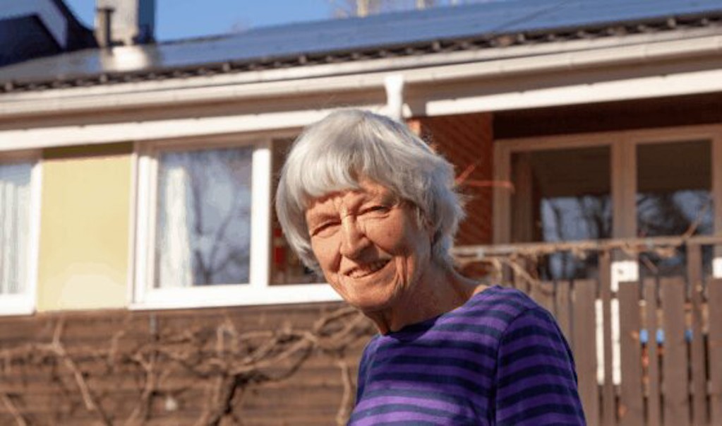 I ett radhusområde på Lidingö utanför Stockholm bor Ingrid Kökeritz, 83, och hennes man Per, 86. Alla hus ser likadana ut vid en första anblick, fast tittar man noggrannare så ser man en liten skillnad på familjen Kökeritz tak och även på grannens. Där sitter ett antal solpaneler men de smälter så bra in i taket att man knappt ser dem.